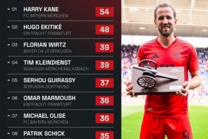 体育资讯5月19日讯 本赛季德甲联赛,凯恩打进26球,蝉联德甲金靴。