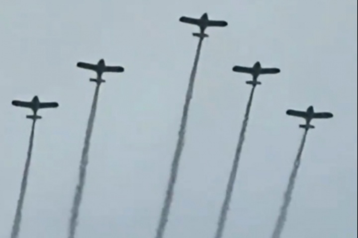 飞跃赛场的高度严格遵守了法律法规,但遗憾的是,因为其中一架飞机担负拍摄任务,所以在地面上看来不够整齐,有点遗憾。