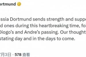 多特在利物浦发布的讣告下面留言:“获悉迪奥戈和安德烈去世的悲痛消息,多特全体成员在这令人心碎的时刻向他们的家人和亲友送去力量和支持。在这悲痛的一天和未来的日子里,我们的心与你们同在。”