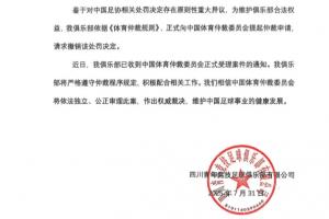 体育资讯07月31日讯 此前遭足协禁赛两年,四川青年竞技俱乐部发布公告表示已经向中国体育仲裁委员会提起仲裁申请,请求撤销该处罚决定。