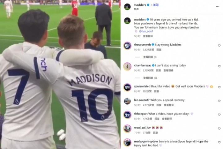 麦迪逊在社媒中晒出了自己与孙兴慜合集片段,并配文:“10年前你来到这里是还是一个孩子。现在你作为传奇&我的朋友的身份离开。你就是托特纳姆孙尼。永远爱你兄弟。”
