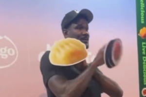 活动现场,艾顿尽情展现搞怪一面,拿着赞助商产品手牌花式应援。