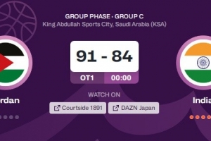 体育资讯8月5日讯 男篮亚洲杯小组赛,约旦91-84加时力克印度。