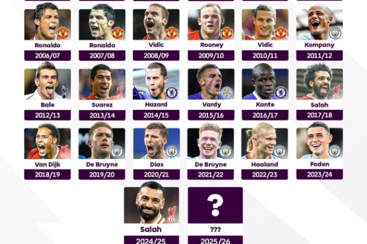 历届英超赛季最佳球员:
