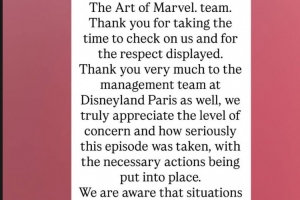 “致巴黎迪士尼乐园管理团队,亲爱的各位,我们对纽约迪士尼酒店-漫威艺术的支持和关怀表示感谢。感谢你们抽出时间关心我们,并展现出尊重。我们也非常感谢巴黎迪士尼乐园的管理团队,我们真诚地感激你们对此事件的重视以及所采取的必要措施。