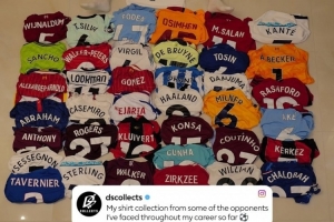 索兰克社媒晒出收藏的球衣,其中包括孙兴慜、萨拉赫、哈兰德、德布劳内、卡塞米罗、安东尼等人的战袍。