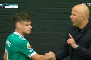 体育资讯09月14日讯 英超第4轮,利物浦客战伯恩利,科尔克兹第38分钟被换下,罗伯逊登场,斯洛特在场边向科尔克兹解释理由。