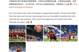 在蓉城队史首场亚冠正赛惜败之后,周定洋在社媒晒出现场照片并配文写道:“今晚是我们首次亮相亚冠精英联赛。为球队的拼搏感到自豪,也感谢远赴韩国、始终高唱助威的球迷们。这只是开始,我们会从这里继续前进。成都雄起 🙌🏼⚽️🧣”