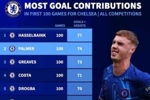 体育资讯9月18日讯 德转晒出切尔西球员百场参与进球数据,帕尔默100场造74球,排名对视第二。