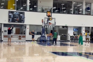 体育资讯10月7日讯 今天,印第安纳记者Tony East晒出了一段步行者球星哈利伯顿投篮训练的视频,他已经在没未佩戴任何护具的情况下进行了三分颠投训练。
