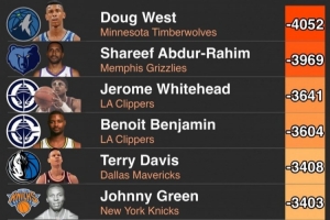 5、特里-戴维斯,累计净胜分:-3408,出战场次:480,场均净胜分:-7.10。