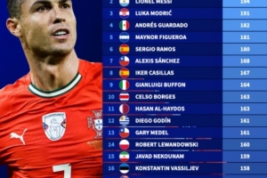 新世纪国家队出场次数排行榜:C罗223场居首,梅西194场次之