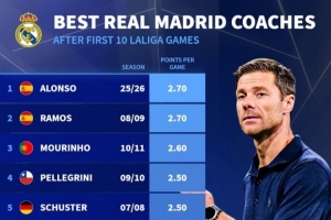 皇马主帅前10场西甲场均拿分榜:阿隆索2.7分并列居首,穆帅第3