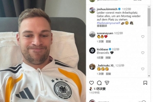 基米希社媒晒出自己在医疗室的照片,并写道:“遗憾的是这里暂时成为了我的工作场所,我会竭尽全力,争取在下周一(对阵斯洛伐克)重返赛场。”