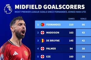 据德国转会市场统计,B费加盟曼联以来出战210场英超比赛,打进66球,同期英超进球数量中场球员之中最多。