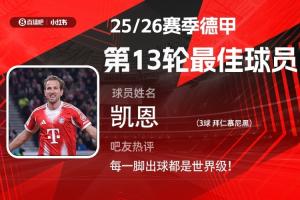 第13轮评选结果结出炉,凯恩替补登场30分钟上演帽子戏法,助拜仁大胜斯图加特,获得吧友超2.7万票支持,当选【体育资讯X小红书德甲第13轮最佳球员】!