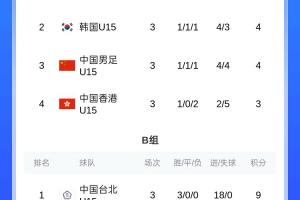 积分榜方面,U15中国队与韩国U15同积4分,相互战绩一致(第二轮交手成绩1-1),但小组净胜球落后对手1球,最终排名第三收官。