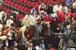 赛后,亚历山大为休斯敦的客场球迷签名。