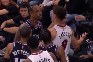 体育资讯1月21日讯 NBA常规赛,热火130-117战胜国王。在比赛中,热火球员拉松和国王球员德罗赞发生了两次冲突。