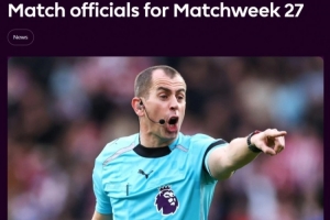 英超第27轮各场裁判: