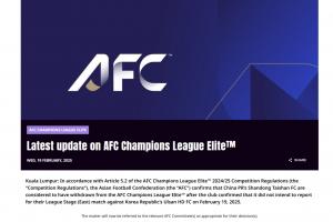 根据《亚足联冠军联赛精英赛2024/25竞赛规程》(简称"竞赛规程")第5.2条款规定,亚足联确认中国山东泰山足球俱乐部因明确表示不参加原定于2025年2月19日与韩国蔚山HD足球俱乐部进行的东亚区联赛阶段赛事,现被视为退出本届亚足联冠军联赛精英赛。