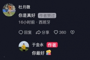 体育资讯3月1日讯 在于金永的社媒评论区,U20国足前锋杜月徵与他互动。