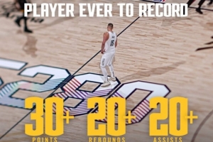 约基奇成为NBA历史上首次打出至少30分20篮板20助攻的球员,掘金官推为他制作了专属海报,并写道:“独一无二🃏。”