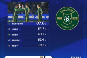 体育资讯4月3日讯 中超联赛官方公布第4轮传球成功率排行榜。在对阵深圳新鹏城的比赛中,浙江队的传球成功率为87.6%,位列本轮第一。